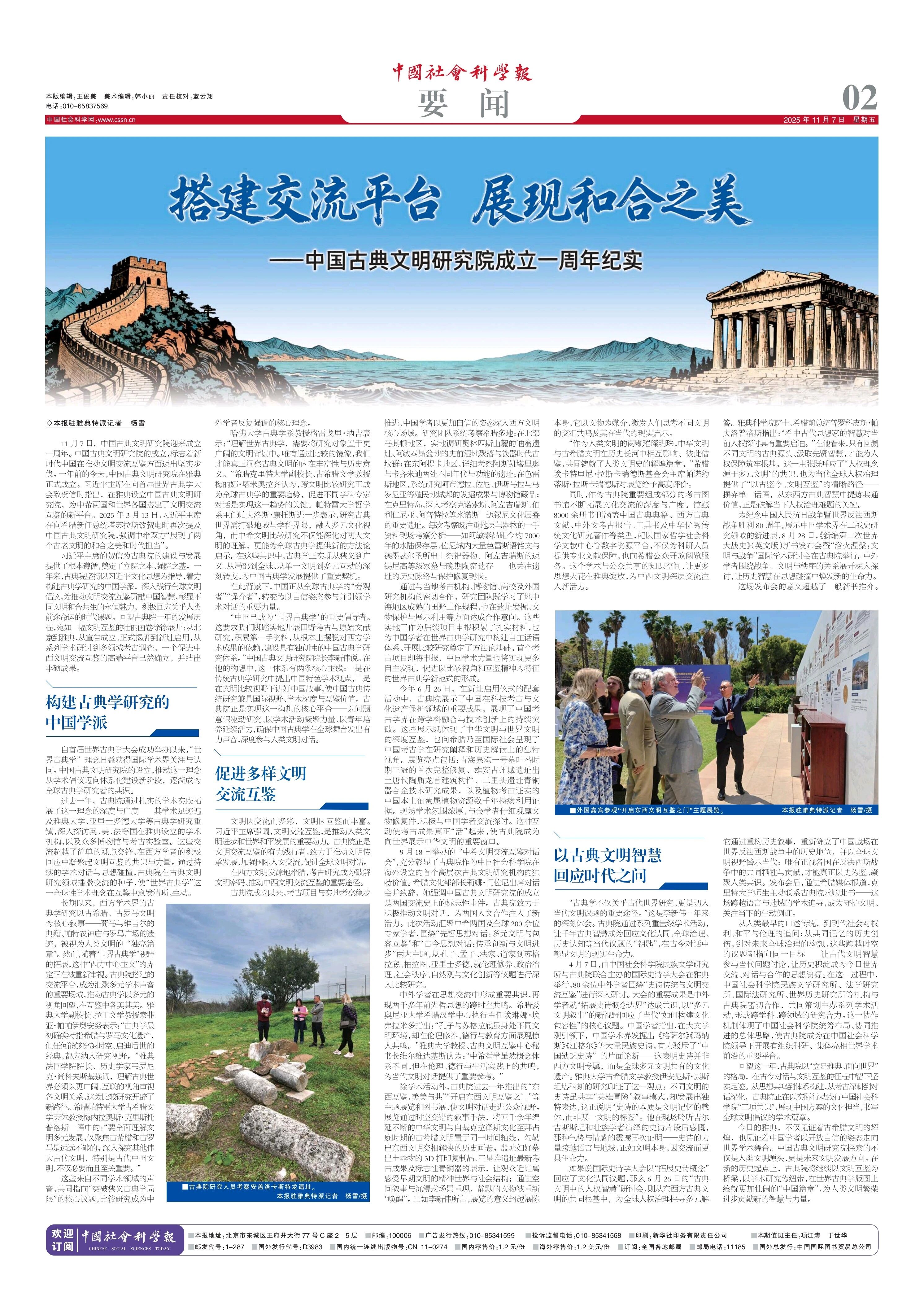 11月7日,中国古典文明研究院迎来成立一周年。中国古典文明研究院的成立,标志着新时代中国在推动文明交流互鉴方面迈出坚实步伐。一年前的今天,中国古典文明研究院在雅典正式成立。习近平主席在向首届世界古典学大会致贺信时指出,在雅典设立中国古典文明研究院,为中希两国和世界各国搭建了文明交流互鉴的新平台。2025年3月13日,习近平主席在向希腊新任总统塔苏拉斯致贺电时再次提及中国古典文明研究院,强调中希双方“展现了两个古老文明的和合之美和时代担当”。